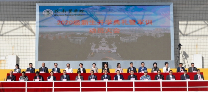 乘风破浪逐梦远航,春华秋实再绘篇章。2020年10月9日,我校在滨江校区举行2020级新生开学典礼暨军训动员大会,近5000名师生同上一堂爱党爱国、爱校荣校的思政大课。在校校领导章尧、廖圣宝、李刚、吴金月、贾贤燕,芜湖市镜湖区人民武装部部长唐斌,学校各职能部门和学院负责人在主席台就座。芜湖市镜湖区人民武装部教官、各学院新生辅导员和2020级全体新生参加大会。大会由副院长吴金月主持。